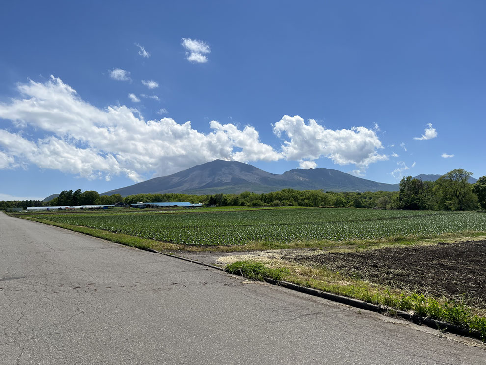 キャベツ畑が広がる高原、朝露にきらめく森の道、それらを見おろすように雄然とそびえる浅間山。